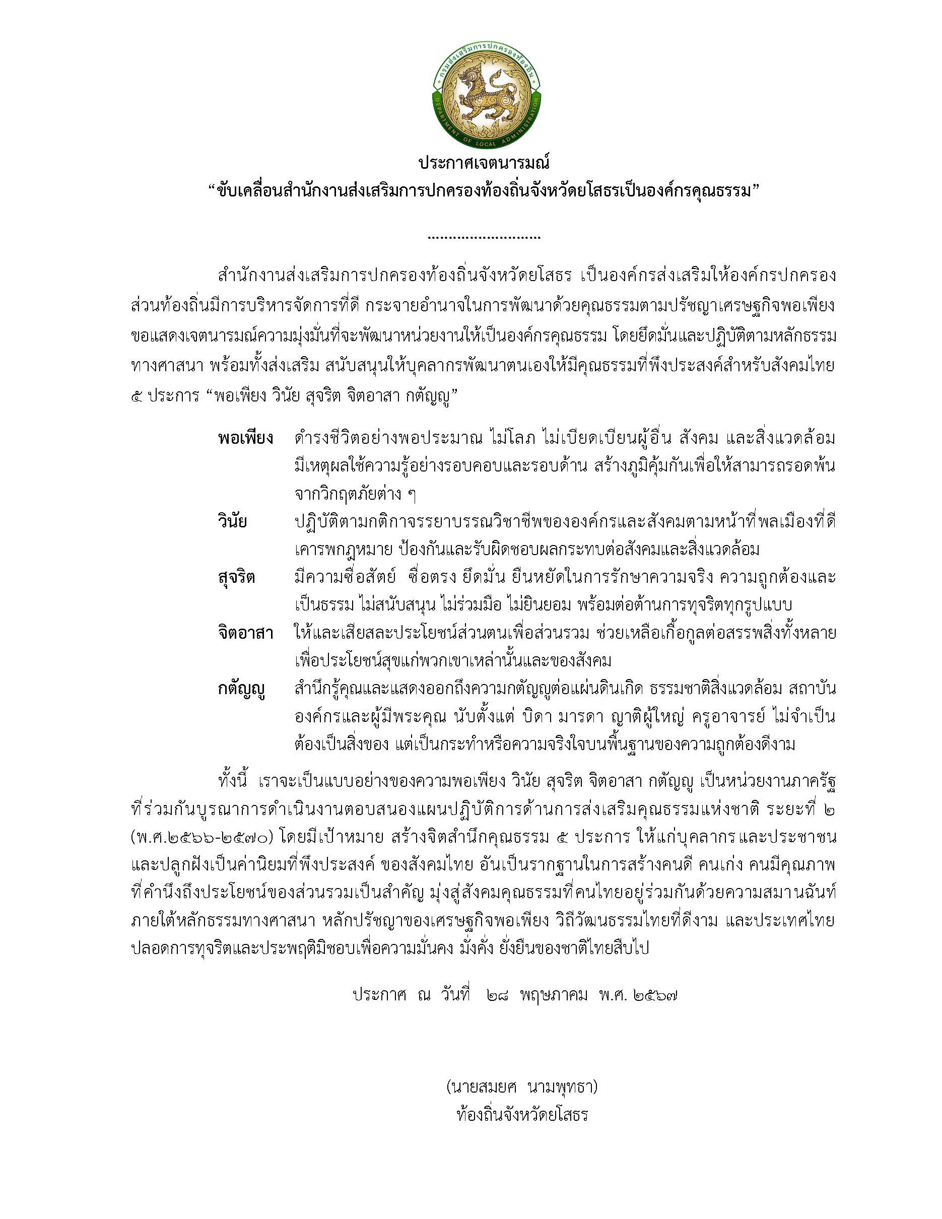 ยโสธร เมือง สถ.จ.ยโสธร ประกาศเจตนารมณ์ “ขับเคลื่อนสำนักงานท้องถิ่นจังหวัดยโสธรเป็นองค์กรคุณธรรม”