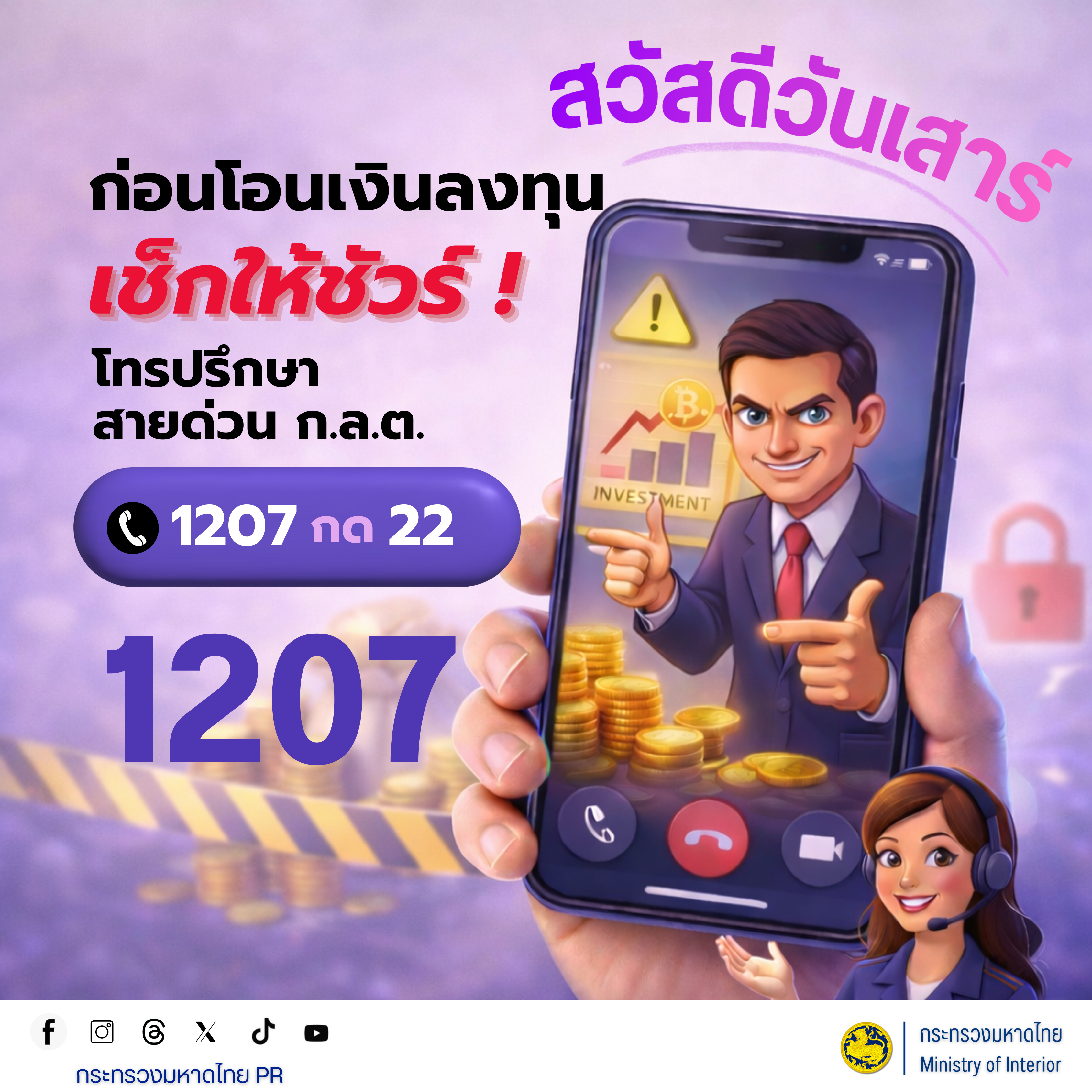 ประชาสัมพันธ์ก่อนโอนเงินลงทุนเช็กให้ชัวร์ โทรปรึกษา สายด่วน ก.ล.ต. 1207